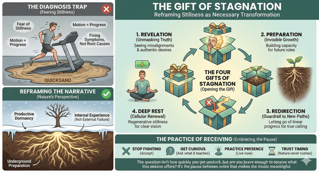 We live in a culture that has forgotten the value of rest. Not the collapsed exhaustion we call rest, but deep, regenerative stillness. Stagnation sometimes arrives as an enforced sabbatical, a mandatory pause that our soul requires but our ego resists.